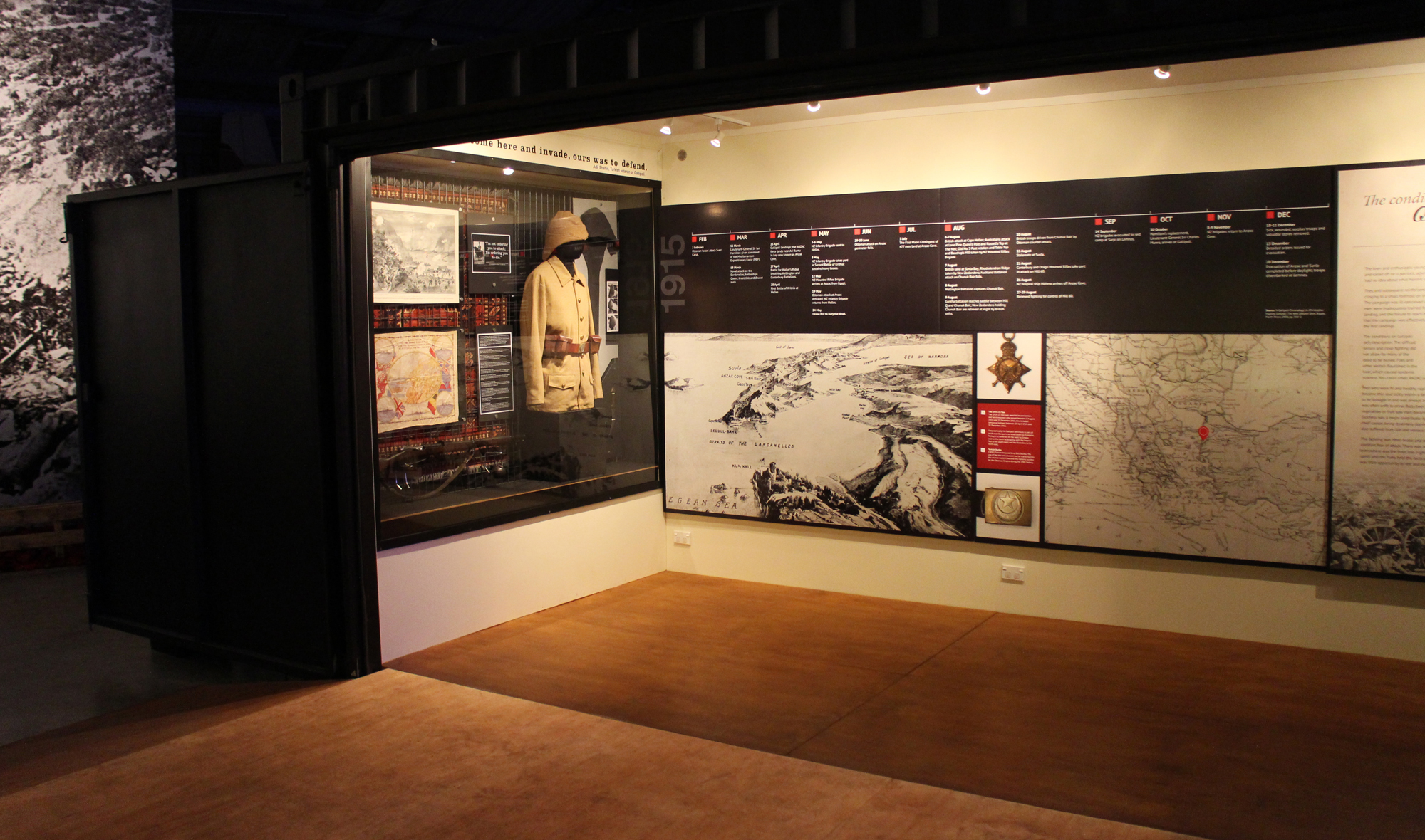 Gallipoli, From Tauranga to the Trenches exhibition focused on the Gallipoli campaign and provided information, photographs and objects which captured the daily undertakings of soldiers at Gallipoli. The exhibition was initially placed at Masonic Park and then relocated to Classic Flyers as part of a larger First World War exhibition created by Metro Marketing. It opened on Anzac Day and was free to the community for a month. The containers then made their first visit to Te Puke where they were looked after by the Te Puke Library. As part of the exhibition Military Historian Dr Cliff Simons wrote: