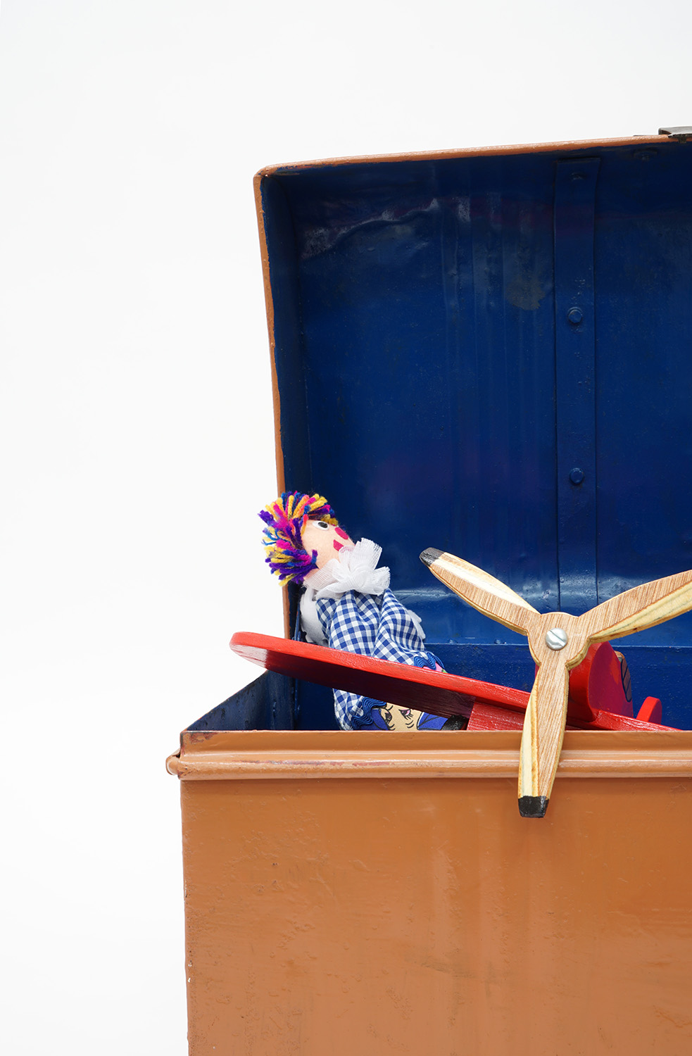 A collection of children's toys in a metal trunk.