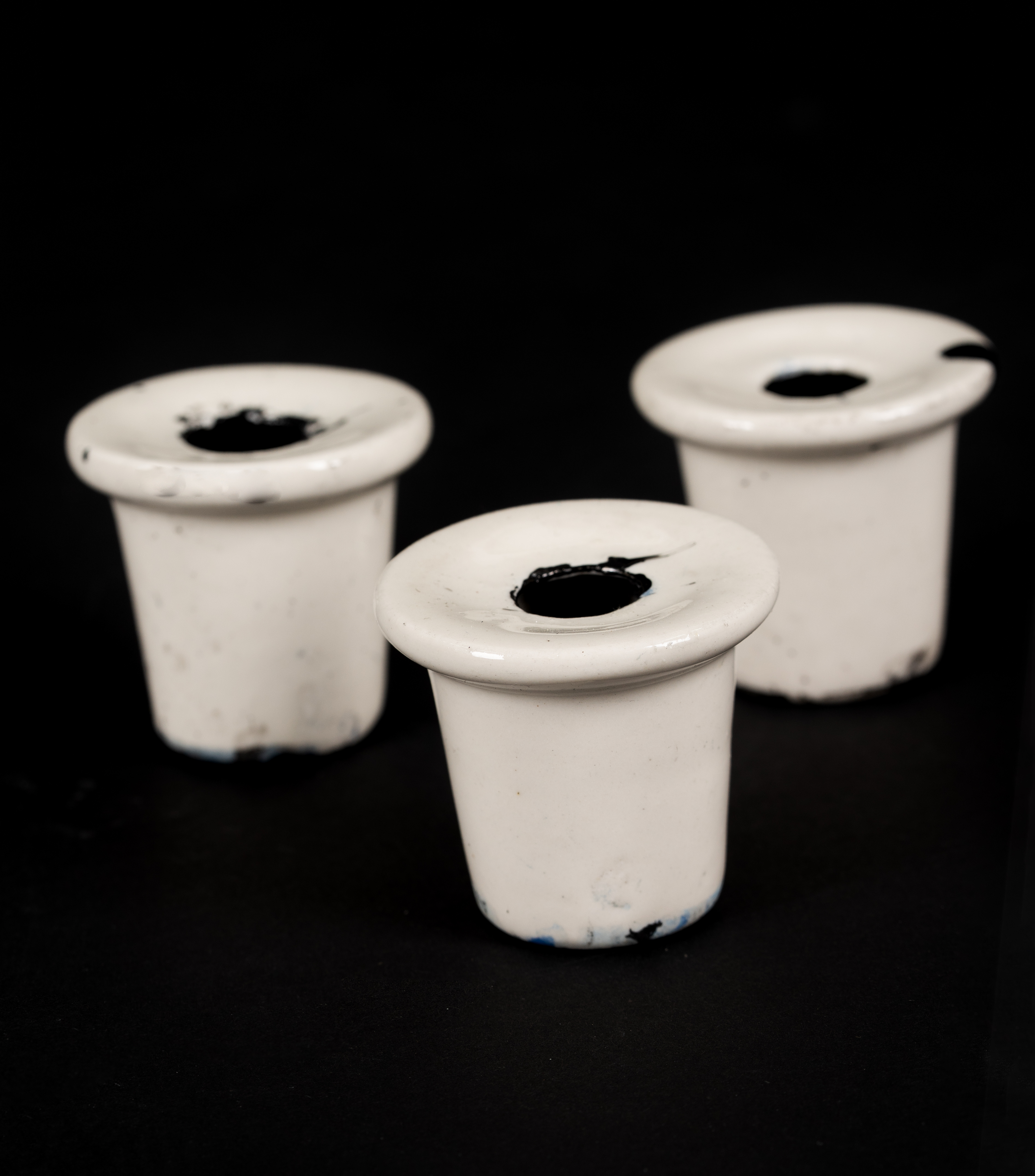 Used to hold ink for a dip pen. School inkwells such as these were placed in holes in the school desk.