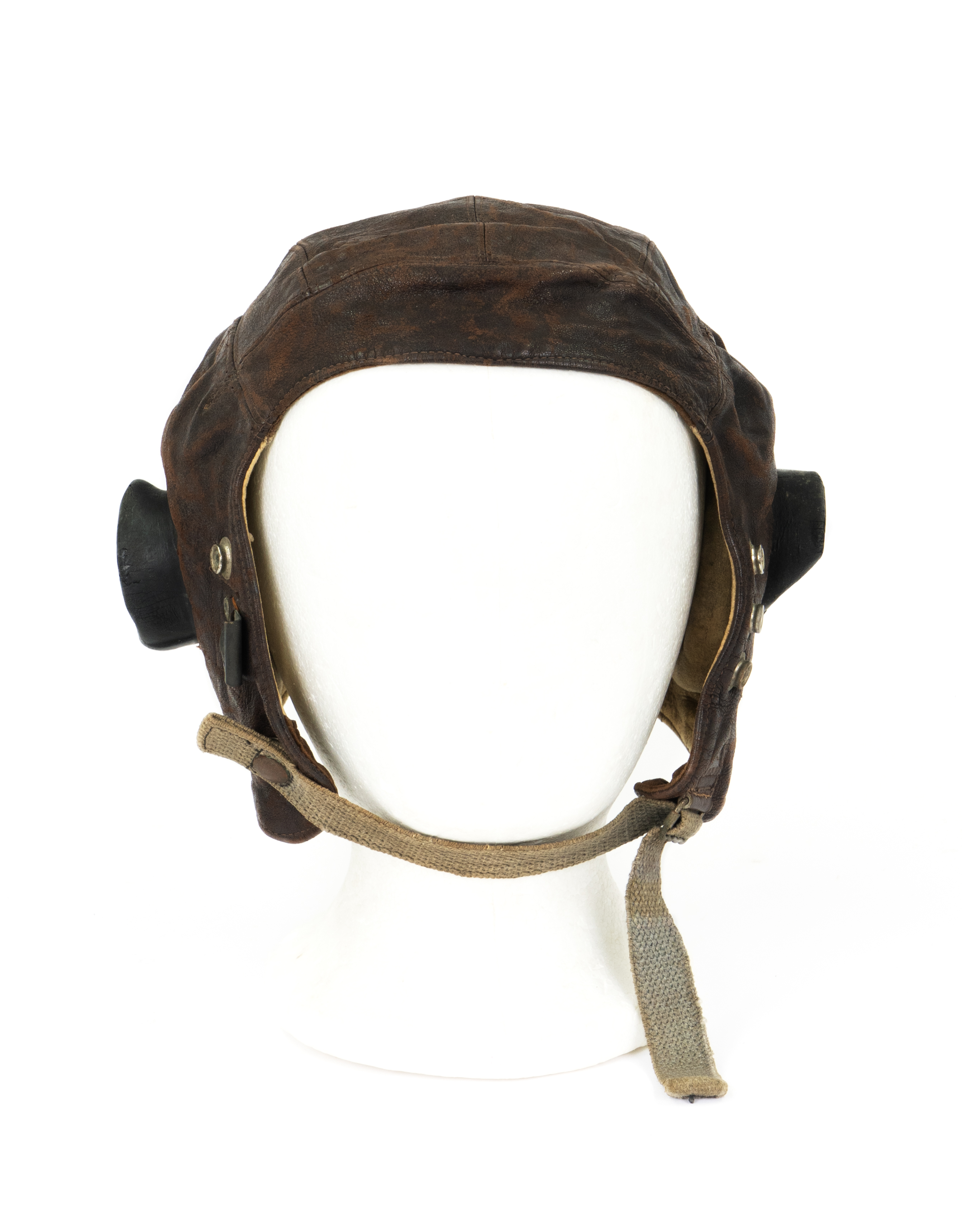 Brown leather flying helmet that fits closely to head. Black rubber ear cups on both sides of helmet. Adjustable leather strap at back and domes at side where oxygen mask would attach.