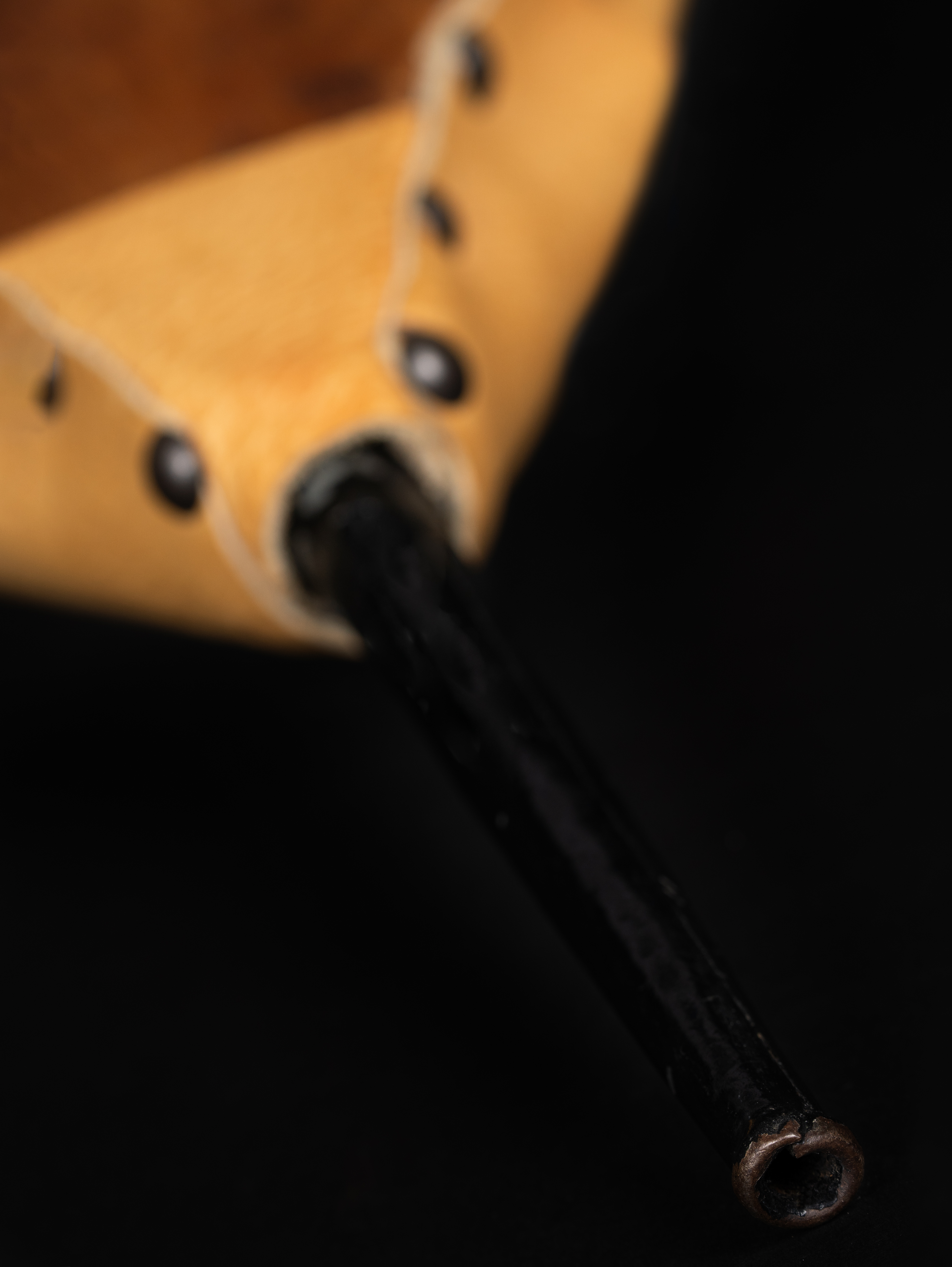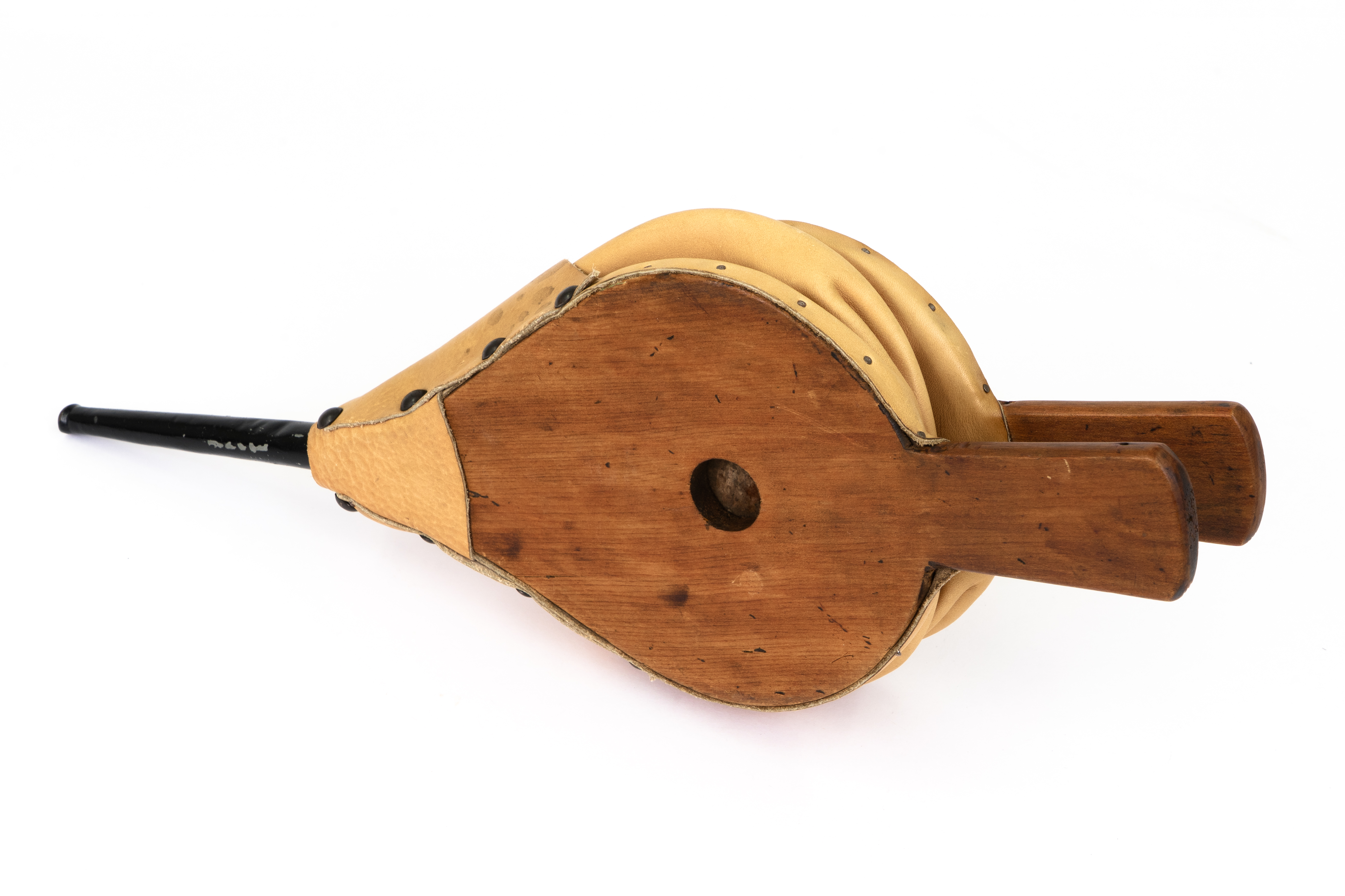 Two tear drop shaped pieces of wood with handles are joined together by a leather sack that folds together. A black metal nozzle at one end.